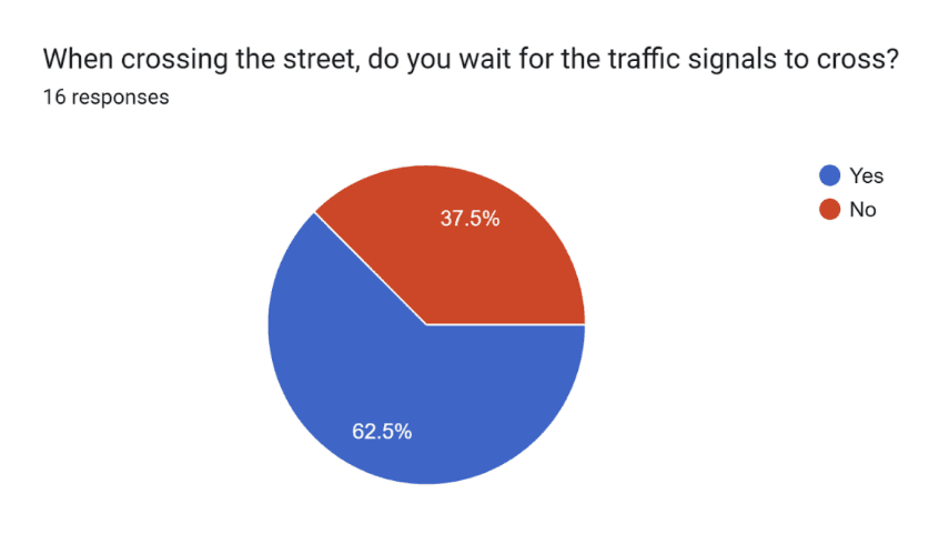 Most pedestrians, when asked if they cross when others in front of them do, said yes, the rest said sometimes, and only one person said no.