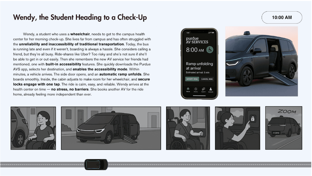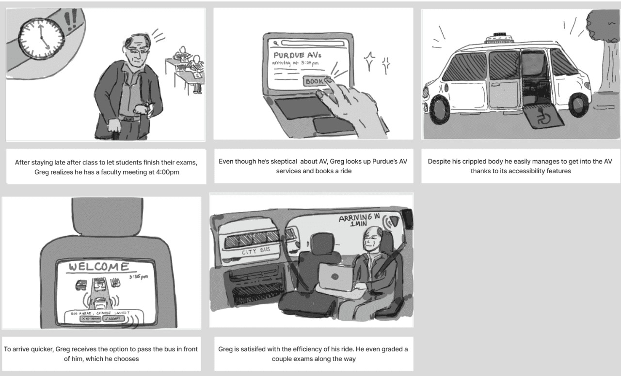 Using the personas created in storyboarding, we created a storybook that visualizes futuristic scenarios between a user and AV that brings attention to potential challenges in a narrative, vignette style with animated panels.